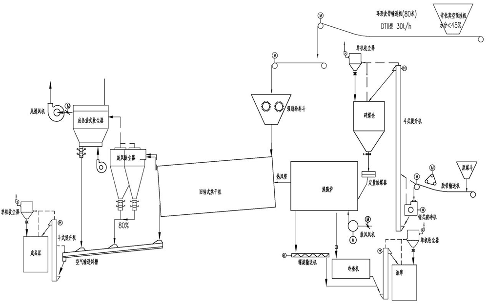 高效回轉(zhuǎn)干燥機(jī),多角度揚(yáng)料板,防聚團(tuán)鉸鏈,螺旋刮料導(dǎo)料套筒,防黏壁振打錘和密閉自潔式強(qiáng)制給料機(jī),燃煤(氣或生物質(zhì)三用)熱風(fēng)爐,沸騰爐底滾筒冷渣機(jī)。